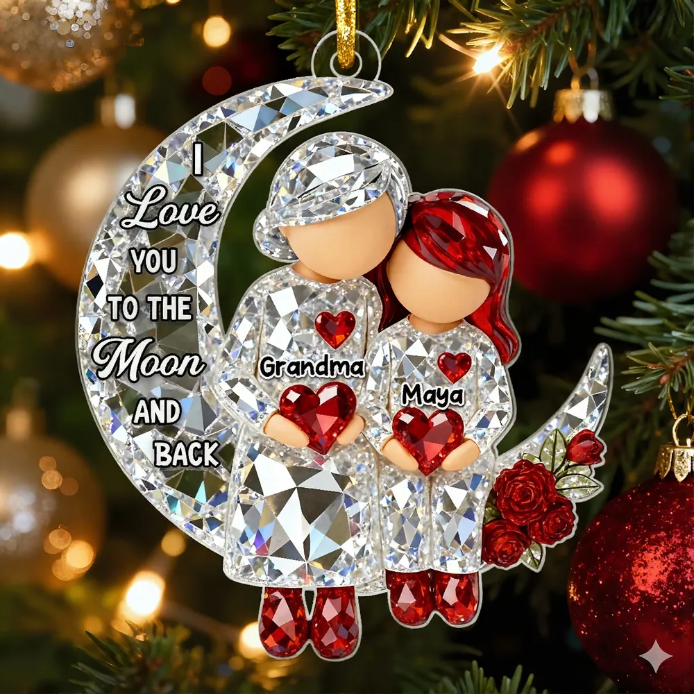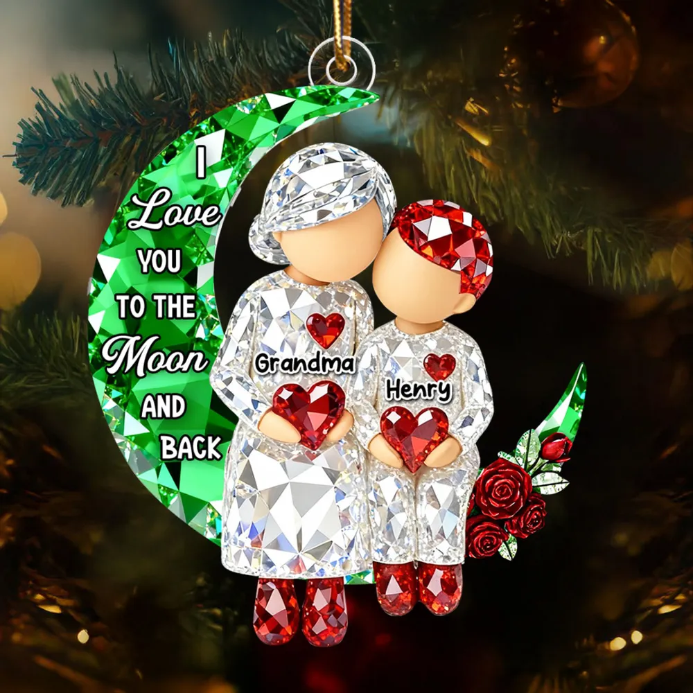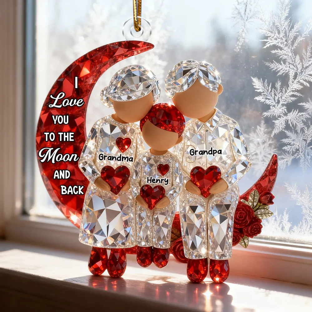 3D Crystal Effect Grandma Grandpa Grandkid Sitting on Moon - Personalized Acrylic Ornament - Christmas Gift for Grandma, Grandkids