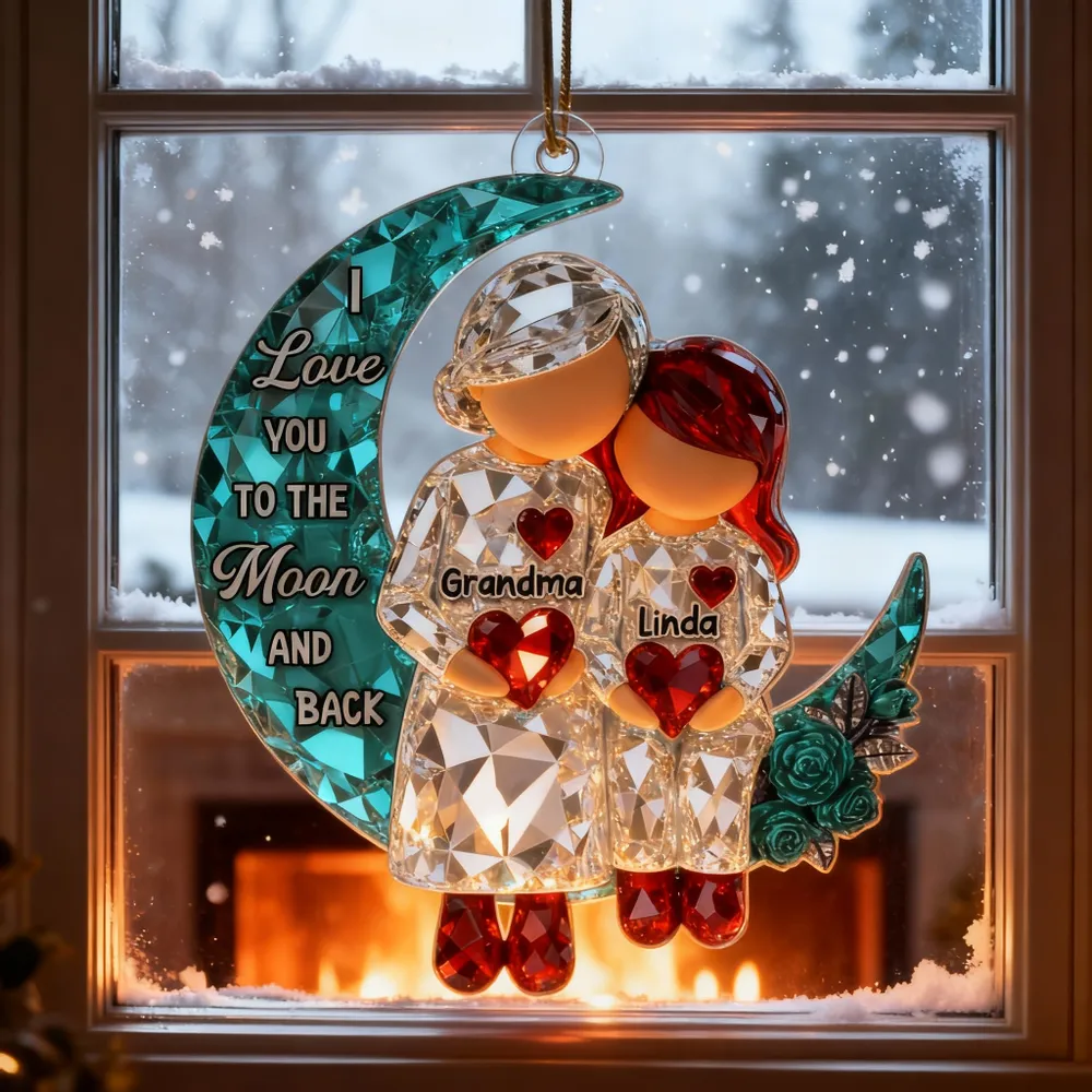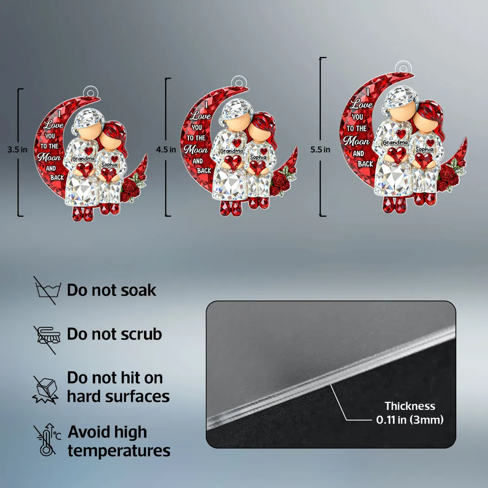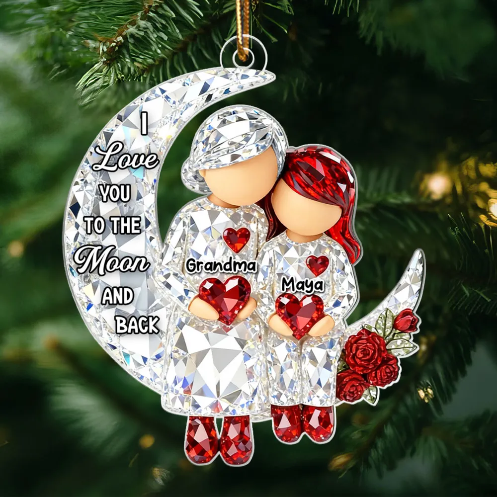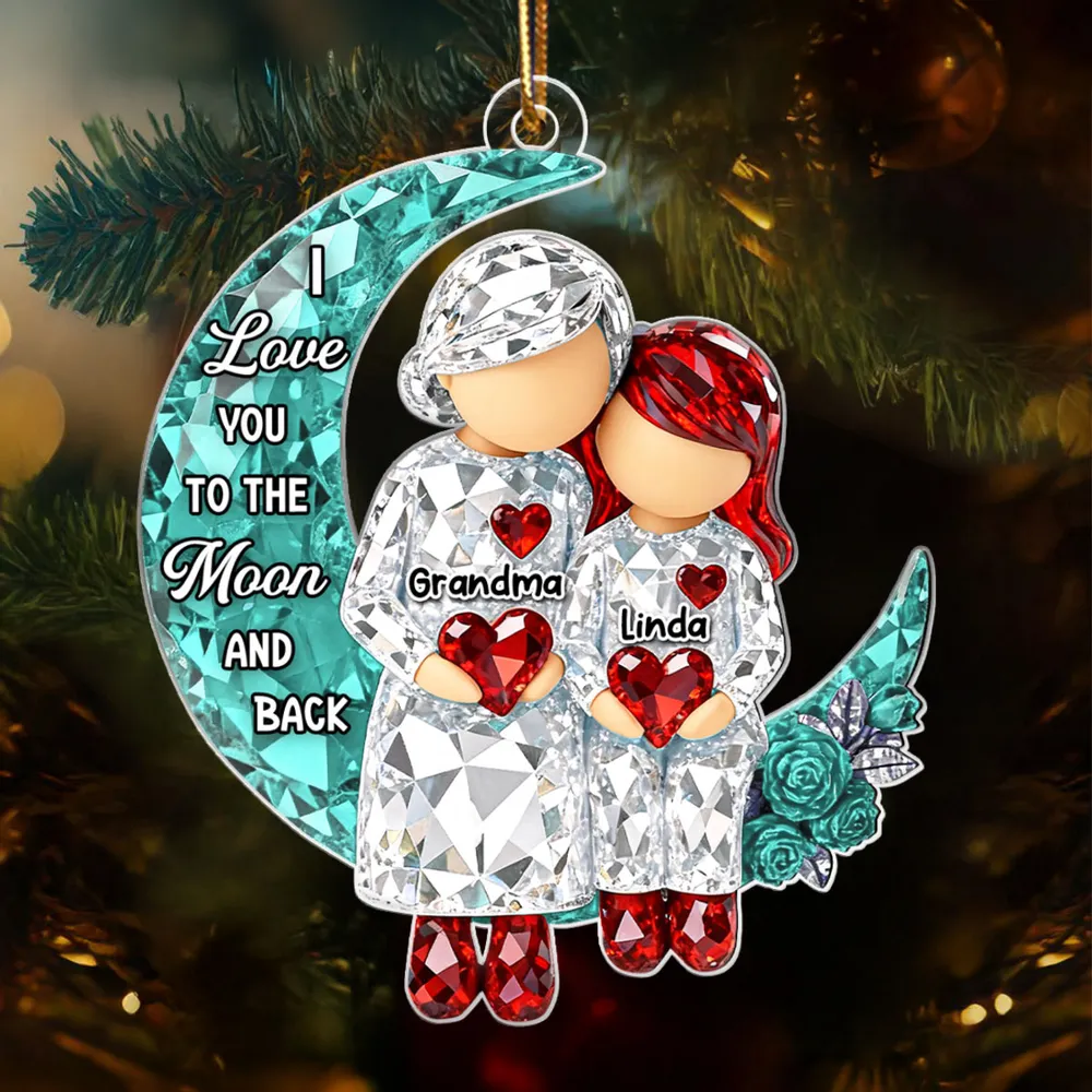 3D Crystal Effect Grandma Grandpa Grandkid Sitting on Moon - Personalized Acrylic Ornament - Christmas Gift for Grandma, Grandkids