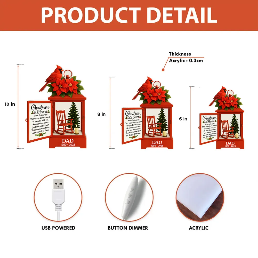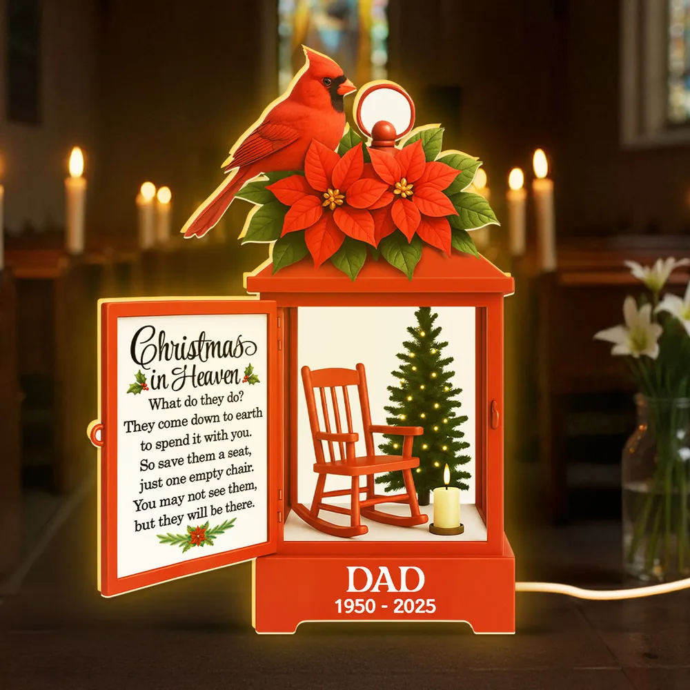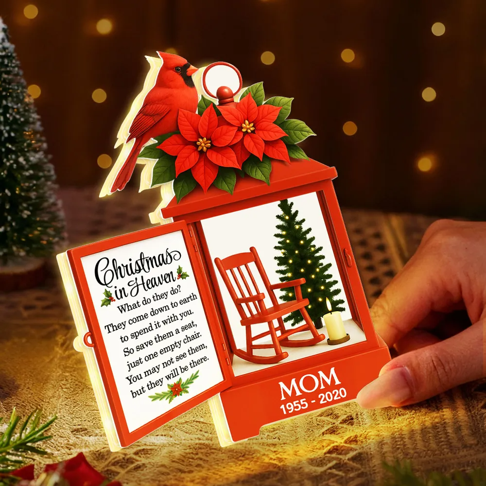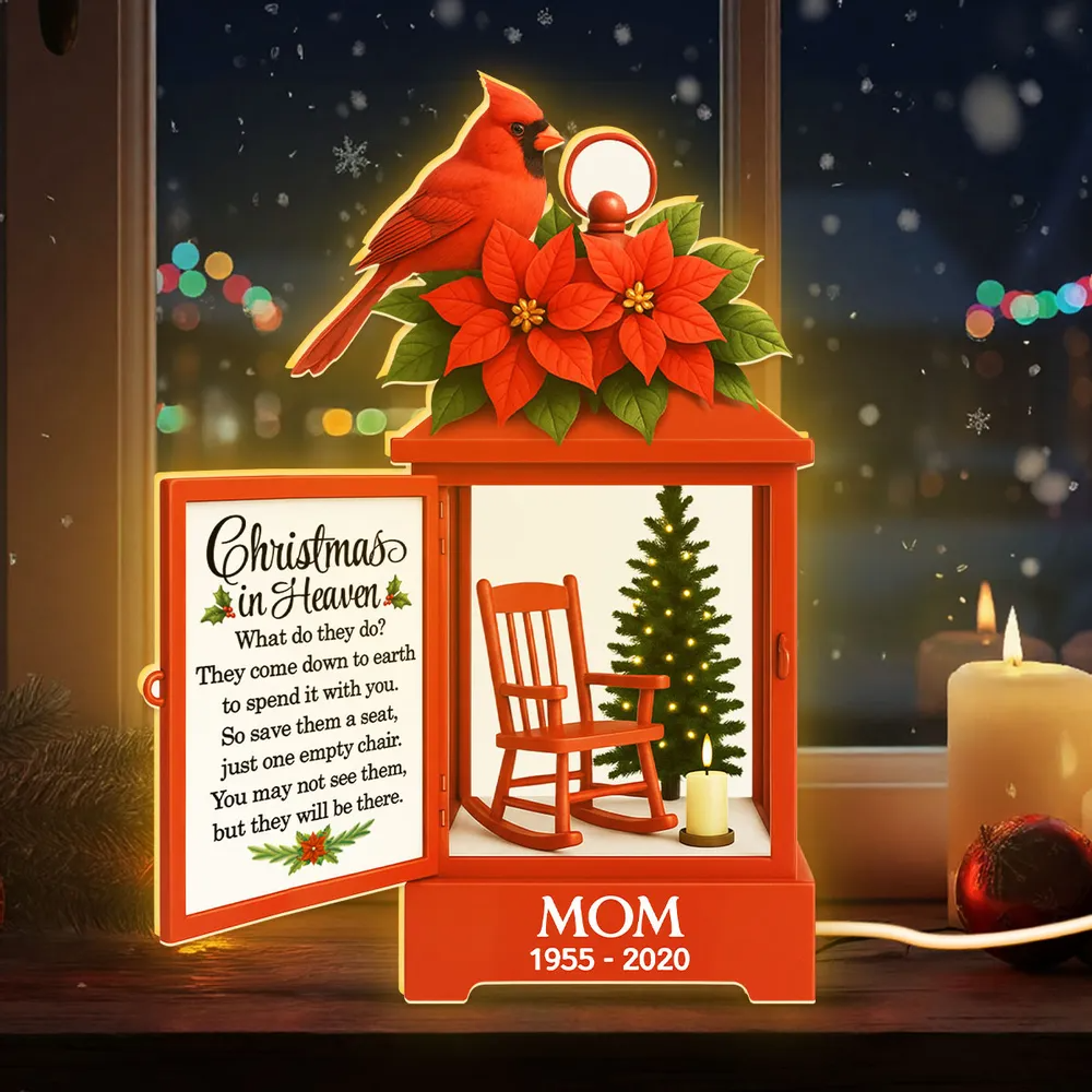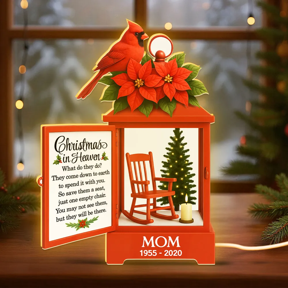 Honor and remember a loved one this holiday season with our Christmas In Heaven Cardinal - Personalized Light Box. Perfect for family members remembering someone lost, or friends gifting to those grieving, this light box brings warmth, comfort, and heartfelt remembrance to your home. Featuring symbolic memorial elements like a cardinal, red flowers, a rocking chair, a lantern, and a meaningful poem, the design evokes love, presence, and connection. The 3D effect adds depth and realism, creating a comforting atmosphere that feels as if your loved one is near during the holidays.