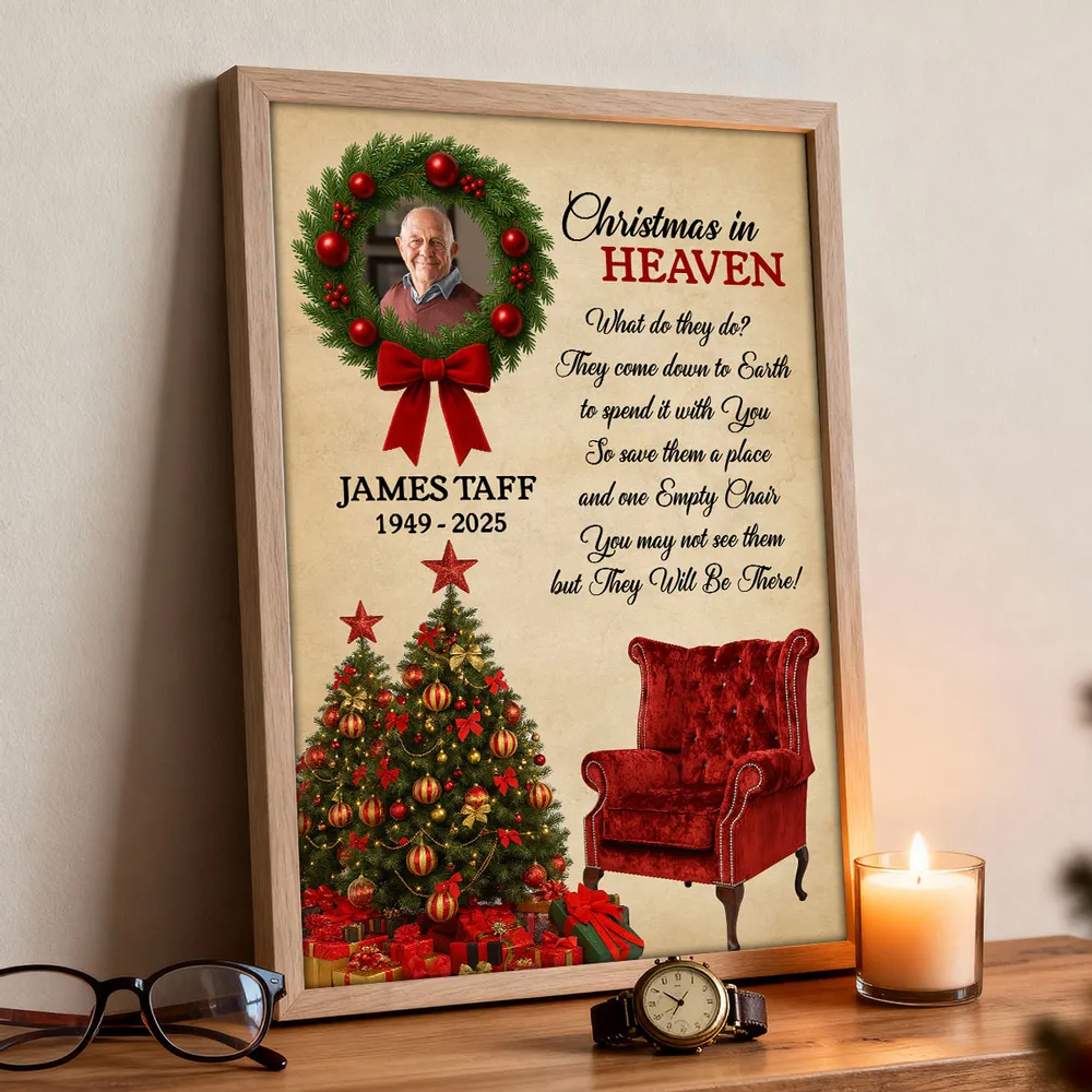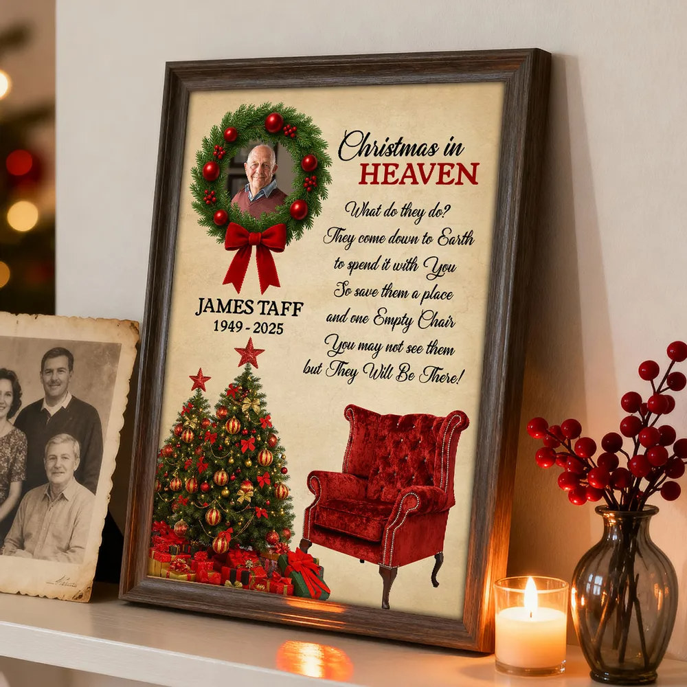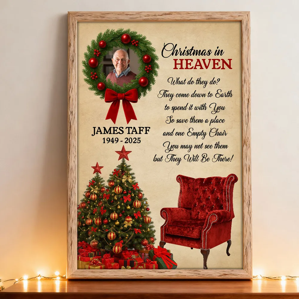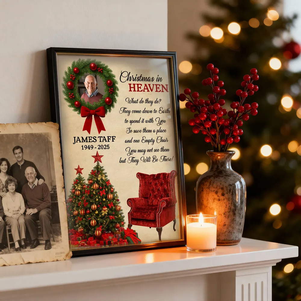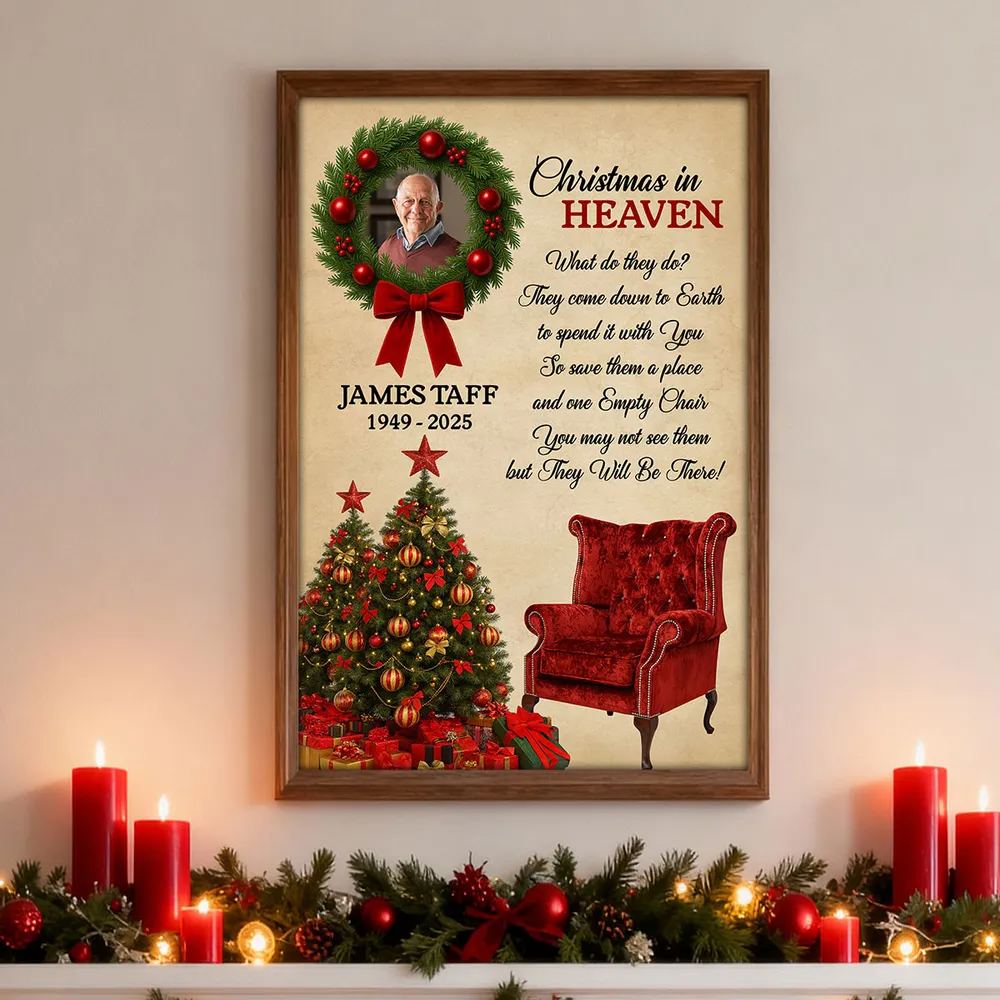 Honor the memory of a loved one and keep their spirit close during the holidays with this Personalized “Christmas in Heaven” Memorial Poster. Beautifully designed with a festive wreath, Christmas tree, and an empty red chair, this heartfelt artwork serves as a touching reminder that those we’ve lost are still with us in spirit. Add your loved one’s photo, name, and years to create a deeply personal keepsake that brings warmth, comfort, and reflection to your home each Christmas season.