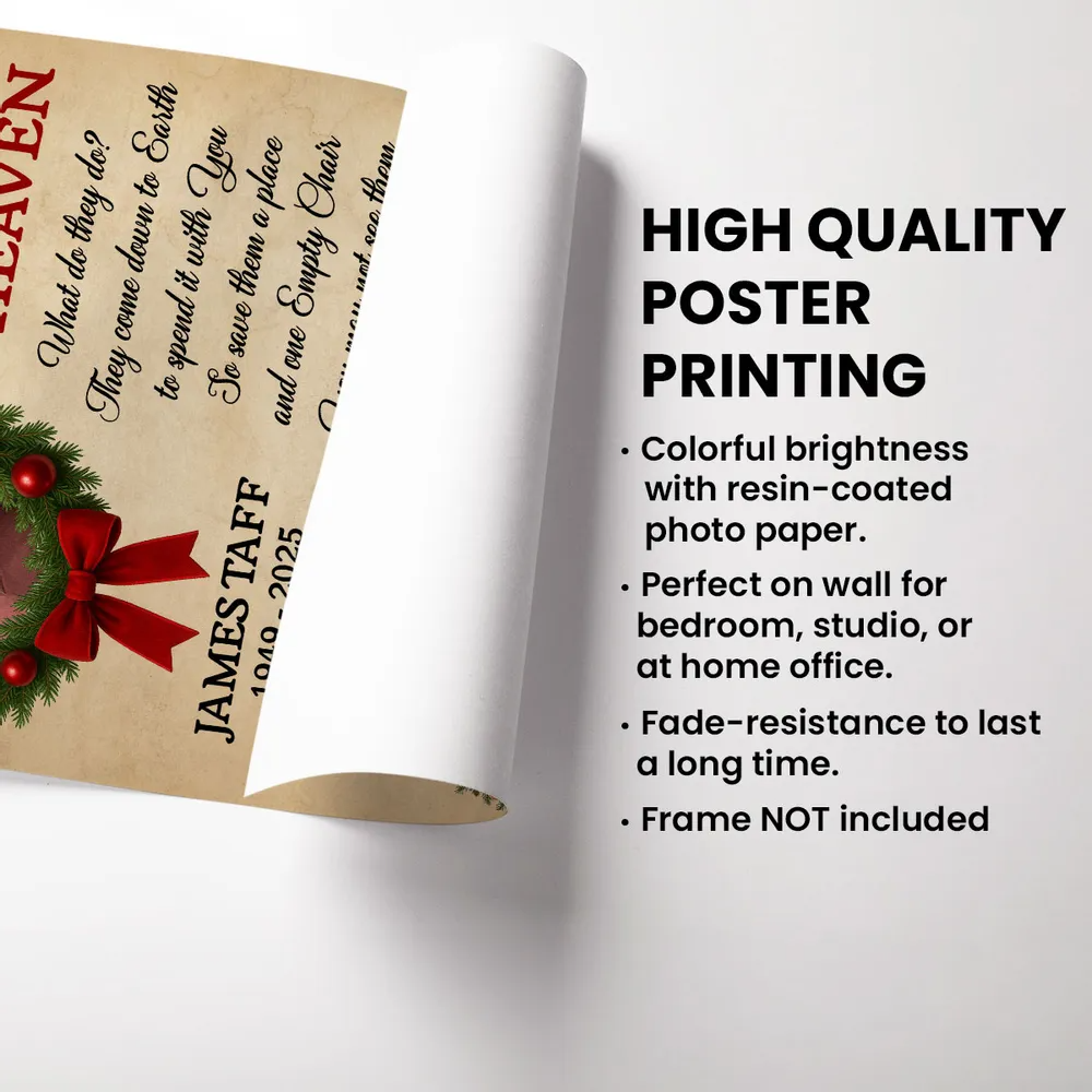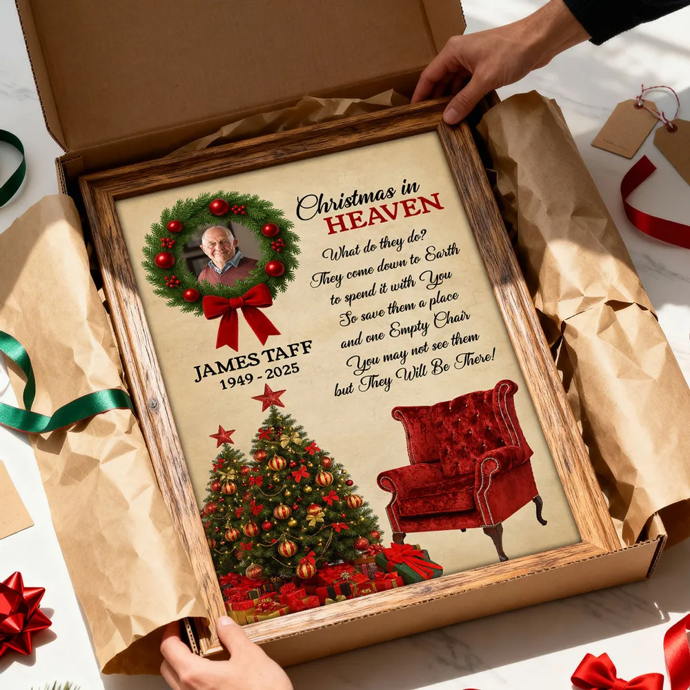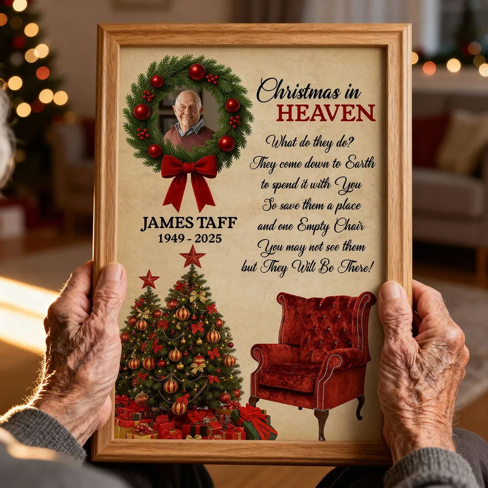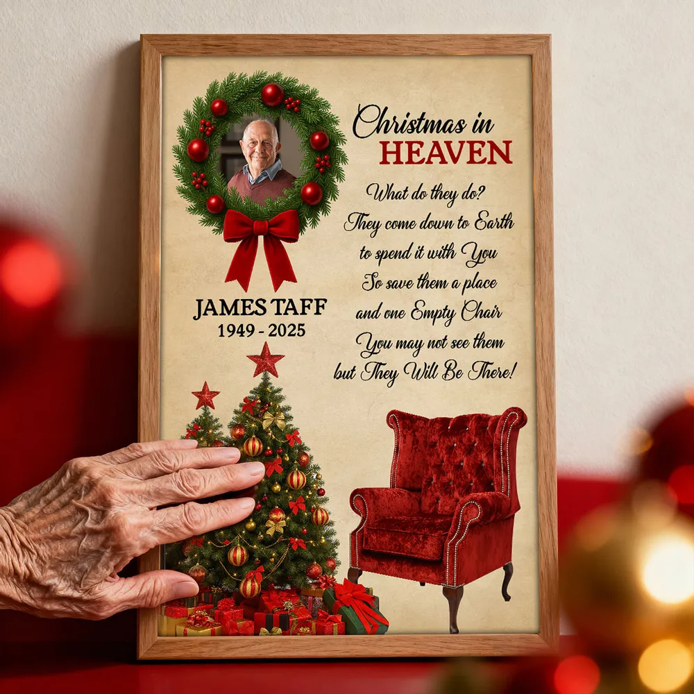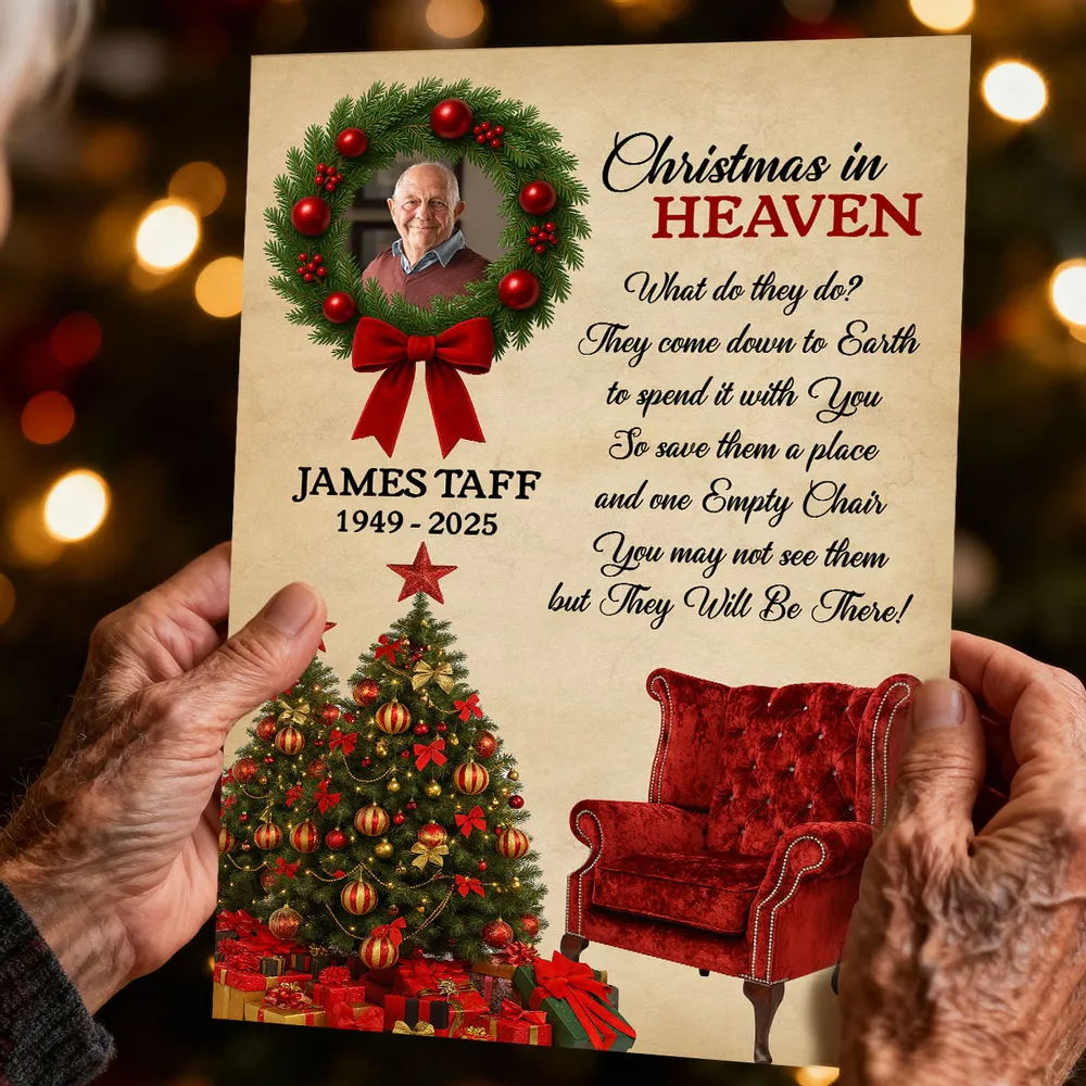 Honor the memory of a loved one and keep their spirit close during the holidays with this Personalized “Christmas in Heaven” Memorial Poster. Beautifully designed with a festive wreath, Christmas tree, and an empty red chair, this heartfelt artwork serves as a touching reminder that those we’ve lost are still with us in spirit. Add your loved one’s photo, name, and years to create a deeply personal keepsake that brings warmth, comfort, and reflection to your home each Christmas season.