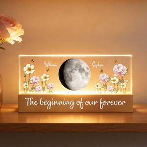 Commemorate the moment your love began with this personalized acrylic block LED night light, featuring the exact moon phase from your special date, your names, and symbolic birth month flowers for each partner. This celestial artwork glows warmly, creating a romantic ambiance while serving as a meaningful keepsake. Perfect for anniversaries, engagements, weddings, Valentine’s Day, or couple milestones.